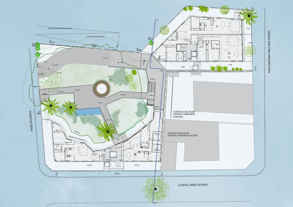 En la zona sur del solar, uno de los edificios se alinea con el paseo marítimo de Málaga, lo que permite que las cuatro viviendas que lo componen disfruten de vistas directas al mar. En el extremo noroeste de la parcela se encuentra el segundo edificio, conformado por cinco viviendas.